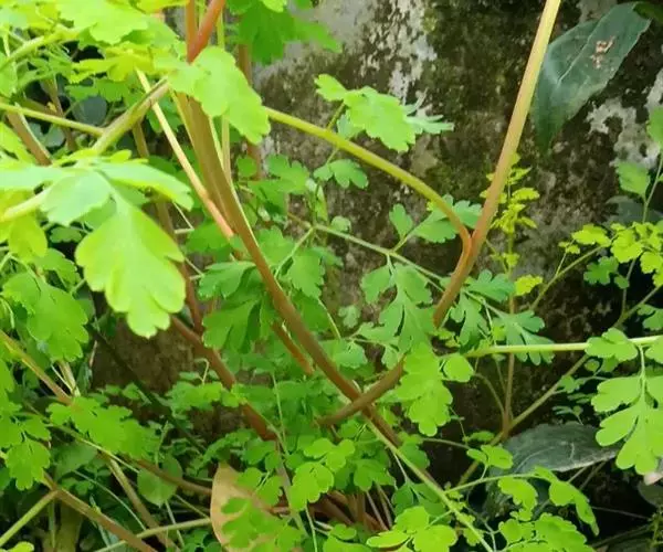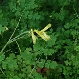 黄堇 灰绿色丛生草本,高20-60厘米,具主根,少数侧根发达,呈须根状。茎1至多条,发自基生叶腋,具棱,常上部分枝。基生叶多数,莲座状,花期枯萎。茎生叶稍密集,下部的具柄,上部的近无柄,上面绿色,下面苍白色,二回羽状全裂,一回羽片约4-6对,具短柄至无柄,二回羽片无柄,卵圆形至长圆形,顶生的较大,约长1.5-2厘米,宽1.2-1.5厘米,三深裂,裂片边缘具圆齿状裂片,裂片顶端圆钝,近具短尖,侧生的较小,常具4-5圆齿。