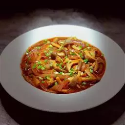 4、油锅烧热,炝香葱末,加白糖、酱油调味,倒入肉汤大火煮沸,再放豆腐、虾仁煮熟,加盐调味,用水淀粉勾芡即可。