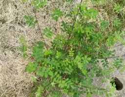 一年生直立草本,高20-60厘米。茎被褐色长硬毛。羽状复叶具3小叶;托叶盾状着生,卵形,长0.8-1.2厘米,具缘毛;小托叶显著,披针形;小叶卵形,长5-16厘米,宽3-12厘米,侧生的多少偏斜,全缘,先端渐尖,基部阔楔形或浑圆,两面多少被疏长毛,基部三脉明显;叶柄长5-21厘米;叶轴长1.5-4厘米;小叶柄长3-6毫米。总状花序腋生,有花4至数朵,最多可达25朵;总花梗长2.5-9.5厘米;花梗长2-3毫米;小苞片线状披针形或长圆形,长4-7毫米,有线条,近宿存;萼管无毛,长3-4毫米,裂片狭三角形,长1.5-4毫米,具缘毛,上方的一对合生成一先端2裂的裂片;旗瓣近方形,长1.2厘米,宽1.6厘米,外面黄绿色,里面有时粉红,顶端微凹,内弯,无毛;翼瓣卵形,黄色;龙骨瓣镰刀状,绿色而染粉红,右侧有显著的囊。荚果线状圆柱形,平展,长4-9厘米,宽5-6毫米,被淡褐色、散生的长硬毛,种子间多少收缩;种子8-14颗,淡绿色或黄褐色,短圆柱形,长2.5-4毫米,宽2.5-3毫米,种脐白色而不凹陷。花期初夏,果期6-8月。