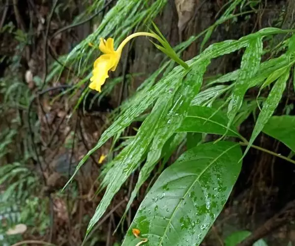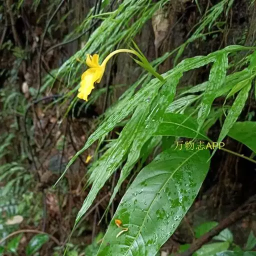 细弱、丛生草本,茎高15-30厘米,径约3毫米。叶5-9片,叶片披针形,长5-14厘米,宽1-2厘米,顶端长尾状渐尖,基部急尖,质薄,无毛,最下部的一片叶较上部的显著地小,无柄或具极短的柄;叶舌圆形,膜质,长不及2毫米。花序顶生,苞片2-3枚,披针形,长3-5厘米,顶端尾状渐尖,内有花1-2朵;花萼管状,长1-1.5厘米;花冠黄色,管长约3厘米,花冠裂片披针形,长约1厘米;侧生退化雄蕊椭圆形,长约1.2厘米;唇瓣黄色,宽卵形,长约1.5-2厘米;花丝短,花药长3毫米;药隔附属体长圆形,长约4毫米。果卵状长圆形,长约1厘米,顶端有宿萼。花期