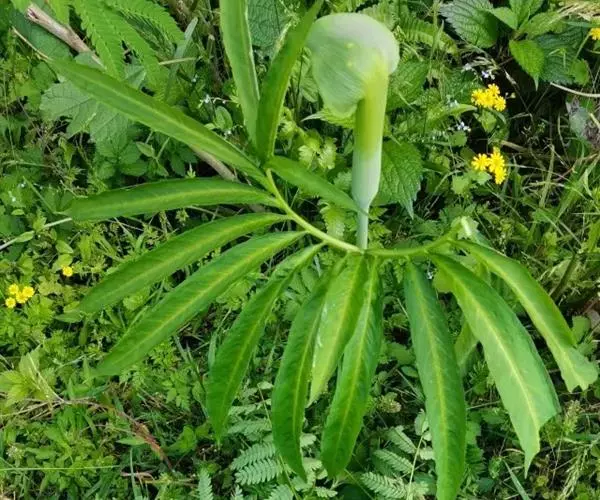 黄苞南星 Schott)是天南星科、天南星属植物,块茎近球形,鳞叶锐尖,叶片鸟足状分裂,…