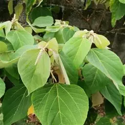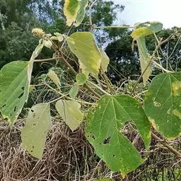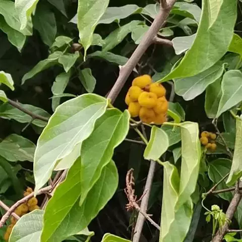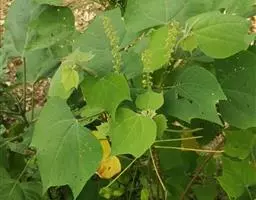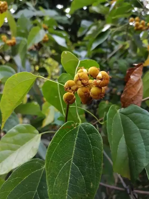 攀缘状灌木;嫩枝、叶柄、花序和花梗均密生黄色星状柔毛;老枝无毛,常有皮孔叶互生,纸质或膜质,卵形或椭圆状卵形,长3.5-8厘米,宽2.5-5厘米,顶端急尖或渐尖,基部楔形或圆形,边全缘或波状,嫩叶两面均被星状柔毛,成长叶仅下面叶脉腋部被毛和散生黄色颗粒状腺体;基出脉3条,有时稍离基,侧脉4-5对;叶柄长2-6厘米。