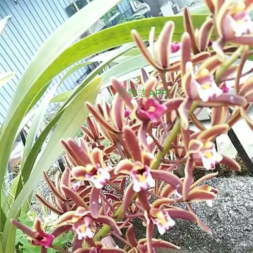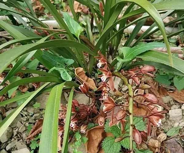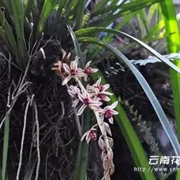 花草发自假鳞茎基部,下垂或外弯,长36~50 cm,近基部具数枚鞘;花序长20~30 cm,具20~40花;花苞片卵状披针形,长4~5 mm;花梗和子房长1.5~2 cm;花浅褐色,直径3~3.5 cm;萼片与花瓣有浅紫色脉和细斑点;唇瓣有浅紫色晕,基部有浅紫色细斑点,在中部两侧有2个深紫色斑块,唇瓣3裂,约等长于花瓣,上面具乳突,侧裂片近半圆形,直立,有紫褐色条纹,边绿紫红色,中裂片近圆形,稍反折,紫红色,中部有浅黄色晕,唇盘从基部至中部具2条平行的褶片,褶片黄色;萼片近相等,萼片狭椭圆形至卵状披针形,长20~22 mm,宽6~7 mm,先端渐尖,红褐色,中部略带黄绿色,边缘稍向后反卷。