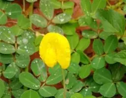 一年生草本。根部有丰富的根瘤;茎直立或匍匐,长30-80厘米,茎和分枝均有棱,被黄色长柔毛,后变无毛。叶通常具小叶2对;托叶长2-4厘米,具纵脉纹,被毛;叶柄基部抱茎,长5-10厘米,被毛;小叶纸质,卵状长圆形至倒卵形,长2-4厘米,宽0.5-2厘米,先端钝圆形,有时微凹,具小刺尖头,基部近圆形,全缘,两面被毛,边缘具睫毛;侧脉每边约10条;叶脉边缘互相联结成网状;小叶柄长2-5毫米,被黄棕色长毛;花长约8毫米;苞片2,披针形;小苞片披针形,长约5毫米,具纵脉纹,被柔毛;萼管细,长4-6厘米;花冠黄色或金黄色,旗瓣直径1.7厘米,开展,先端凹入;翼瓣与龙骨瓣分离,翼瓣长圆形或斜卵形,细长;龙骨瓣长卵圆形,内弯,先端渐狭成喙状,较翼瓣短;花柱延伸于萼管咽部之外,柱头顶生,小,疏被柔毛。荚果长2-5厘米,宽1-1.3厘米,膨胀,荚厚,种子横径0.5-1厘米。花果期6-8月。