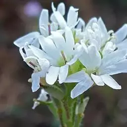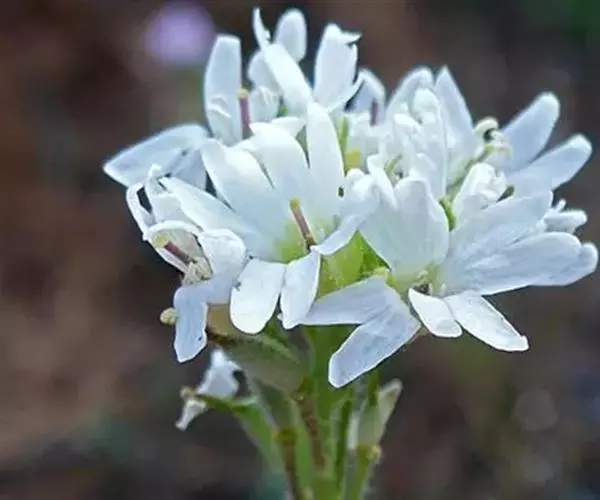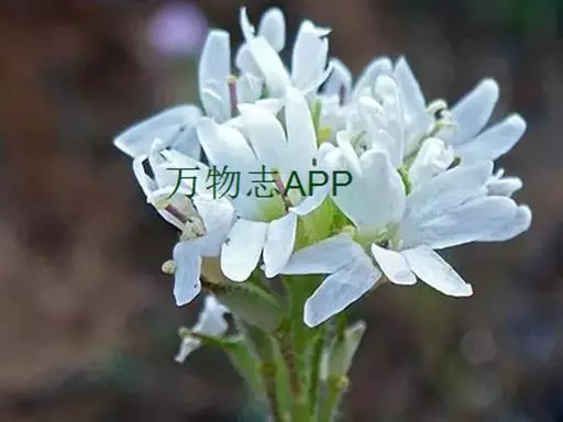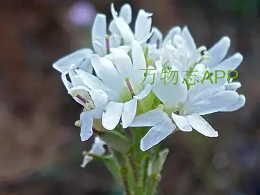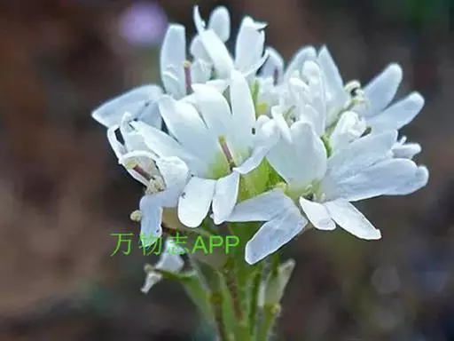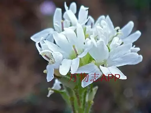 团扇荠(5张) 二年生草本,高20-60(-80)厘米,被分枝毛。叶与果瓣上毛略呈贴伏状,并杂有一些长单毛。茎不分枝,或于中、上部分枝。基生叶早枯,茎生叶向上渐小,下部叶长圆形,长4-6厘米,宽8-15毫米,顶端钝圆或略尖,基部渐窄成柄,边缘具不明显的波状齿或齿,上部叶长圆形,长约1厘米,宽1-2毫米,顶端渐尖,基部楔形,边缘有不明显的齿。花序伞房状,果期伸长,花梗长5-8毫米;萼片直立,长圆形,长2.7-3毫米,宽1-1.5毫米,边缘白色,外轮的基部略成囊状;花瓣白色,长5-8毫米,顶端2深裂,深达2毫米,为花瓣长的1/3-2/5,裂片顶端圆,花瓣下部1/3为爪;长雄蕊花丝扁,向基部变宽;短雄蕊花丝单侧具齿。短角果椭圆形,长约6毫米,宽3-5毫米,压扁或稍膨胀,无毛;花柱宿存,长3-3.5毫米,下部有星状毛,柱头头状,微2裂;果瓣扁平;果梗长7-9毫米,斜上升,或贴近果序轴。种子每室多粒,圆形,黑褐色。花期6-7月。