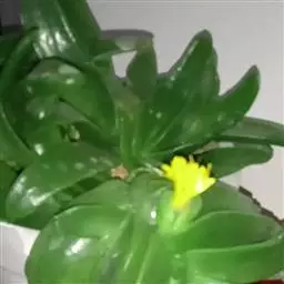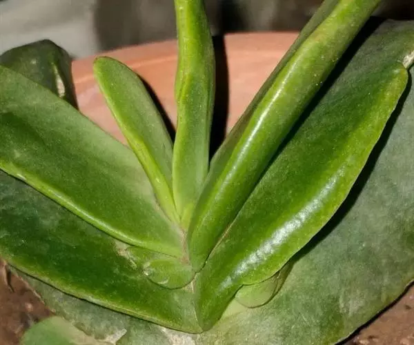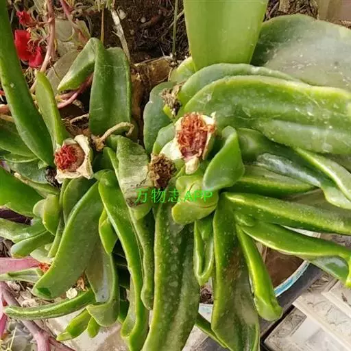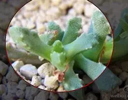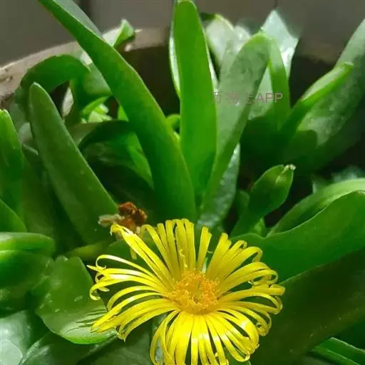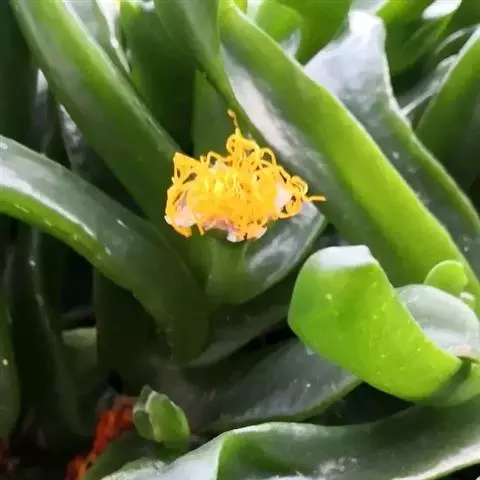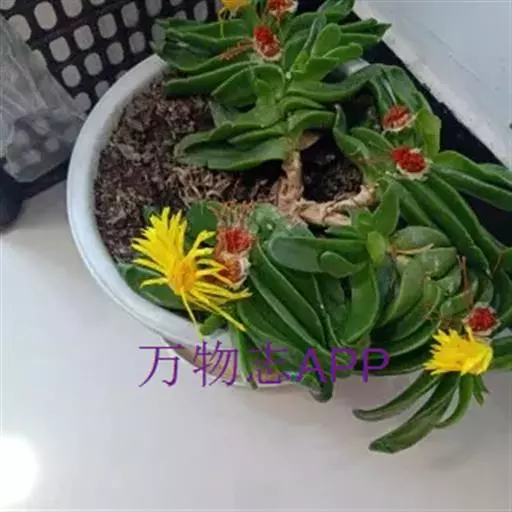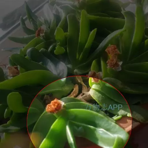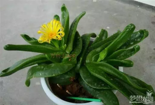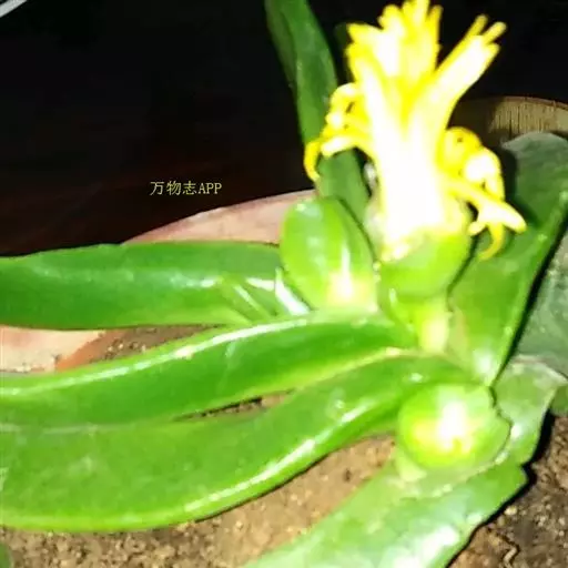 佛手掌,极短,肉质叶舌状,对生2裂,长约10cm,宽2-3,鲜绿色,平滑有光泽。叶端略向外反转,株形像佛手。秋冬季开花,花自叶丛中抽出,花冠金黄色。