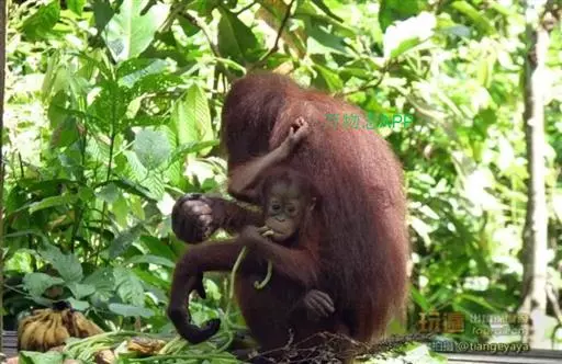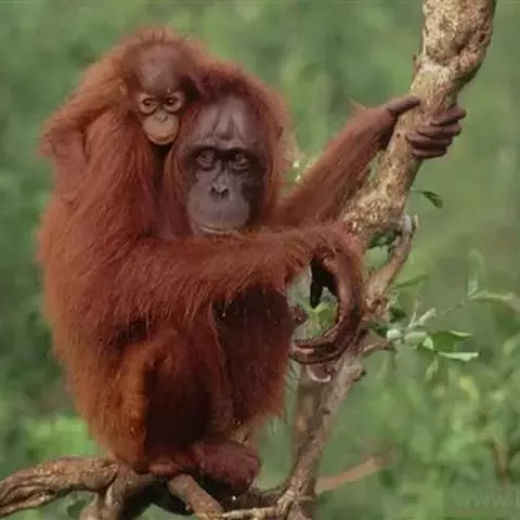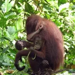 猩猩母子 亚洲猩猩一度广泛分布在东南亚和中南半岛,现仅存于婆罗洲和苏门答腊岛北部的热带山地森林、低地龙脑香森林、热带泥炭沼森林和热带卫生保健林中。现发现湿地森林生境生活着高密度的红毛猩猩群;苏门答腊岛北部则有大约9000只红毛猩猩存活,它们主要活动在一个国家公园的四周;另有10000~15000只红毛猩猩生活在婆罗洲岛,主要活动在八个隔离区。