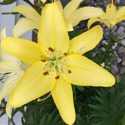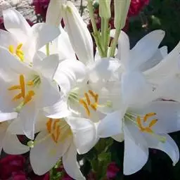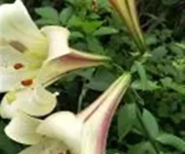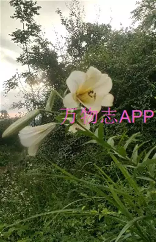 野百合(学名:Lilium brownii F.E.Br. ex Miellez):鳞茎球形,直径2-4.5厘米;鳞片披针形,长1.8-4厘米,宽0.8-1.4厘米,无节,白色。茎高0.7-2米,有的有紫色条纹。叶散生,具5-7脉,全缘,两面无毛。花单生或几朵排成近伞形;花喇叭形,有香气,乳白色,外面稍带紫色,无斑点,向外张开或先端外弯而不卷。蒴果矩圆形,有棱,具多数种子。花期5-6月,果期9-10月。