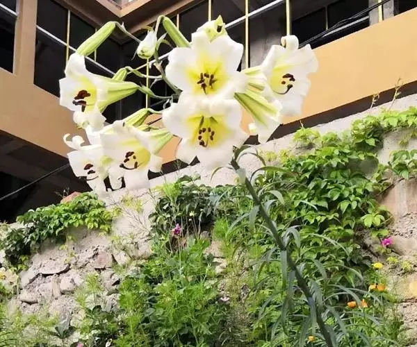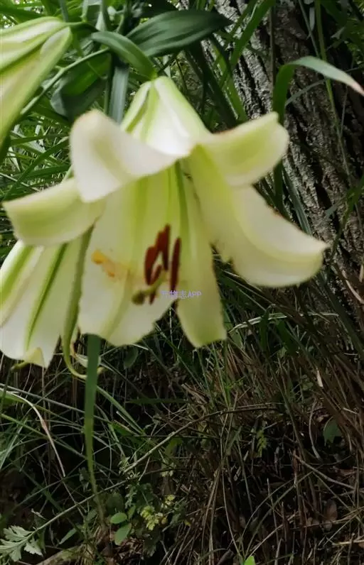 花单生或几朵排成近伞形;花梗长3-10厘米,稍弯;苞片披针形,长3-9厘米,宽0.6-1.8厘米;花喇叭形,有香气,乳白色,外面稍带紫色,无斑点,向外张开或先端外弯而不卷,长13-18厘米;外轮花被片宽2-4.3厘米,先端尖;内轮花被片宽3.4-5厘米,蜜腺两边具小乳头状突起;雄蕊向上弯,花丝长10-13厘米,中部以下密被柔毛,少有具稀疏的毛或无毛;花药长椭圆形,长1.1-1.6厘米;子房圆柱形,长3.2-3.6厘米,宽4毫米,花柱长8.5-11厘米,柱头3裂。