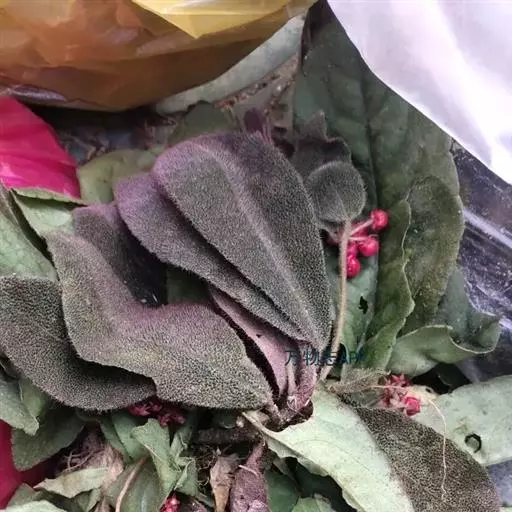 虎舌红 该种与莲座紫金牛相似,但该种植株较高,茎较长,叶面的毛基部隆起如小瘤,极易区别。该种有的个体全株为紫红色,有的则为绿色,故有红毛毡与白毛毡之称。