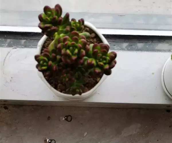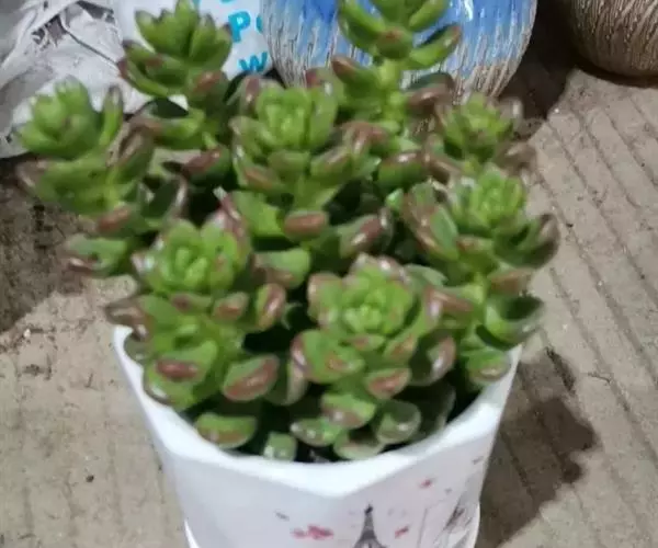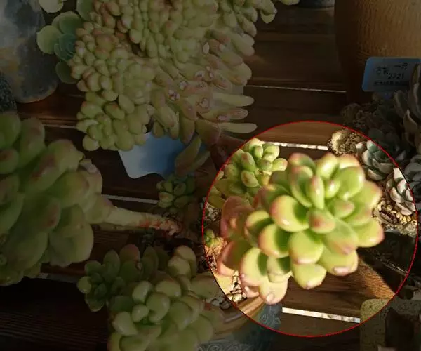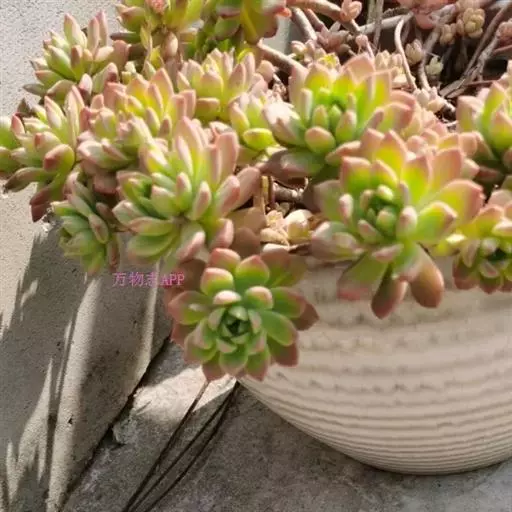 乔伊斯·塔洛克,多年生小型多肉草本植物。植株直立,易生侧芽,且侧芽多,常形成枝繁叶茂的群生株。叶子匙形,或舟形,叶面较平滑,中间略凹陷,叶背面凸起,龙骨不明显,交互对生或轮生,叶端钝,无小尖,全叶披毫毛。5-10月,一般以绿为叶的主色调,叶缘稍有红晕;11月至翌年4月,叶的基色调以红为主,在重组阳光、大温差和排水良好介质的共同影响下叶片变红。花期4-5月,聚伞花序,开花5瓣,星形,外瓣粉色,内瓣白色,花梗红色。