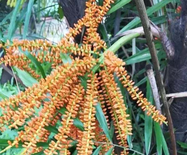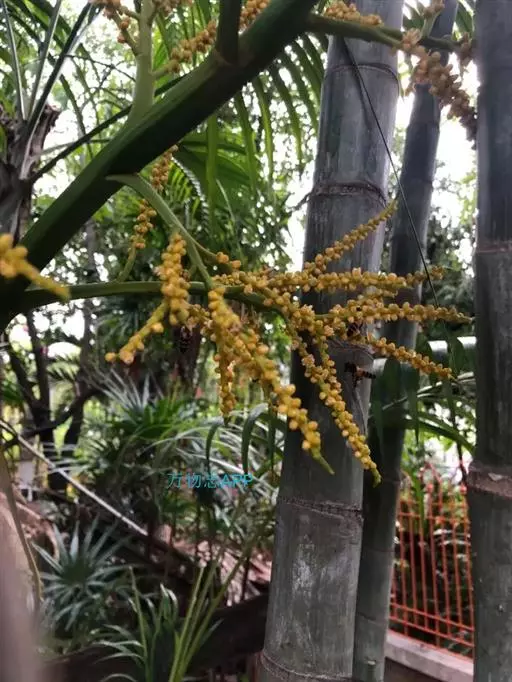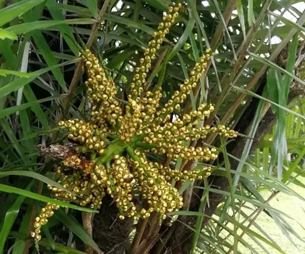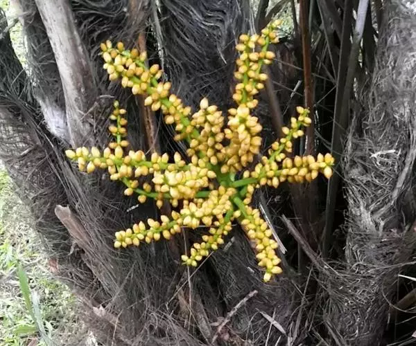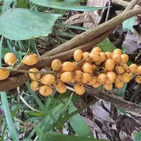 花序生于叶间,长30-50厘米,多分枝,分枝长约30厘米,螺旋状排列于花序轴上;花雌雄同株;雄花稍大,长约1.5厘米,黄色,有香气,萼片3,覆瓦状排列成杯状,花瓣3,长椭圆形,长1.5厘米,雄蕊约40枚,不具芒尖;雌花近球形,花萼近圆形,花瓣三角形,长约6毫米,宽5毫米。果实近球形,钝三棱,充分成熟时为红色,直径约1.8厘米,高1.7厘米。种子3颗,通常有1种子发育不全,黑褐色,钝三棱状,长1厘米,宽0.8厘米,厚0.6厘米,胚乳均匀,胚背生。花期5-6月,果期11-12月。
