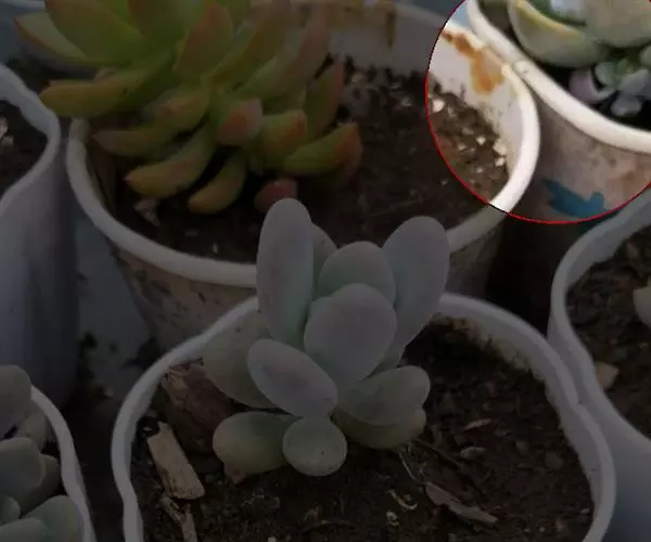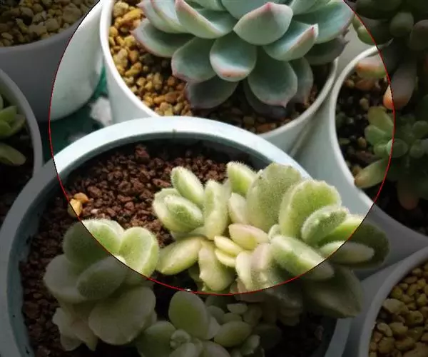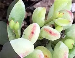 植株呈多分枝的矮小灌木状,老茎深褐色,幼枝灰色,肥厚多肉的叶片交互对生,叶卵形,长2~3厘米,宽1~1.5厘米,顶部的叶缘具缺刻。叶片表面密生白色的细短绒毛,叶尖有几个小爪强光下会变红。
