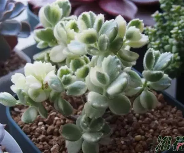 熊童子白锦(学名:Cotyledon ladismithiensis var iegata),是景天科银波木属多年生肉质草本植物,熊童子白锦总状花序,花为微红色,原产非洲的纳米比亚。