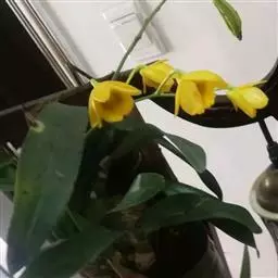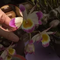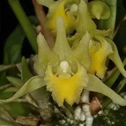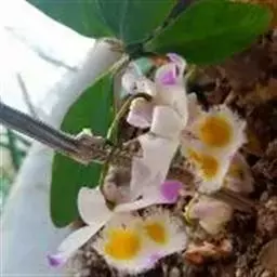 矮石斛(学名:Dendrobium bellatulum Rolfe):茎直立或斜立,粗短,纺锤形或短棒状,具许多波状纵条棱和2-5节。叶2-4枚,近顶生,革质,舌形,卵状披针形或长圆形。总状花序顶生或近茎的顶端发出,具1-3朵花;花开展,除唇瓣的中裂片金黄色和侧裂片的内面橘红色外,均为白色;花瓣倒卵形,等长于中萼片而较宽,先端近圆形,具5条脉;唇瓣近提琴形,长约3厘米,3裂。花期4-6月。