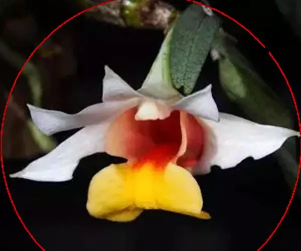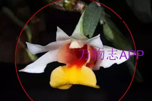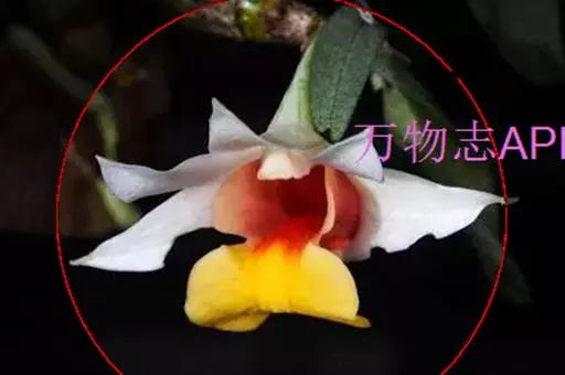 总状花序顶生或近茎的顶端发出,花序轴长5-7毫米,具1-3朵花;花序柄长2-3毫米;花苞片膜质,卵状披针形,长7-10毫米;花梗和子房长约2.5厘米;花开展,除唇瓣的中裂片金黄色和侧裂片的内面橘红色外,均为白色;中萼片卵状披针形,长约2.5厘米,宽约1厘米,先端急尖,具7条脉;侧萼片斜卵状披针形,长2.5厘米,宽1厘米,先端急尖,具7-8条脉;萼囊宽圆锥形,长约1厘米。
