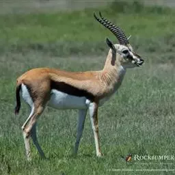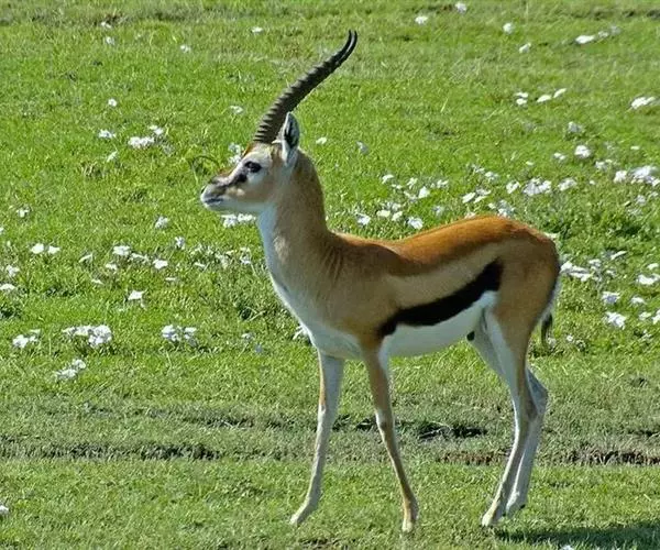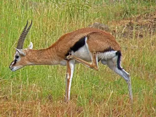 汤普逊瞪羚是诸多瞪羚中最出名的一种,它和我国的藏羚羊 瞪羚 、蒙古黄羊同属一类。它们身材娇小,体态优美,是草原食肉动物渴望的美餐。汤普逊瞪羚对付强敌的办法就是“逃跑”。非洲草原上,它的速度仅次于猎豹。而且它的纵身一跳可高达3m,跨度9m。雄性瞪羚是好斗的,尤其表现在争夺伴侣和领土上,他们通过对抗或者彼此用角的顶撞来决定谁是胜利者,战败者将会离开此地去寻找新的领地。小瞪羚出生五分钟后,就能跟着母亲跑动了,六周左右,小瞪羚就已经是短跑健将了。这是他们天生的本领,因为周围的猛兽太多了,不如此就难以存活,小瞪羚还有一种保护自己的方法,就是保持低调,躲在草丛中,这个方法十分管用,就连强大的猎豹,也无法发现它,再加上小瞪羚还未发育成熟,身上也没有过重的气味,瞪羚母亲还经常舔小瞪羚,让它身上仅有的一点气味也消失不见,让它更不容易被发现。汤普逊瞪羚胆小而敏捷,一旦发现危险,就会撒开长腿急速奔跑,速度可达每小时90km。羚羊的寿命较短,一般不超过20岁。瞪羚虽然也是个奔跑健将,但它比不上自己的仇敌猎豹。两个同样善跑的动物为了各自的生存,常常展开“追逐战”。但往往猎豹在汤普逊瞪羚的几次突然转向后,只能望“羊”兴叹了。瞪羚能飞快的逃离捕食者。当危险临近时,它们四条腿直直的向下伸,身体腾空高高跃起。这种被称为腾跃的动作,用来警告其他瞪羚有危险,同时也能起到迷惑敌人的作用。