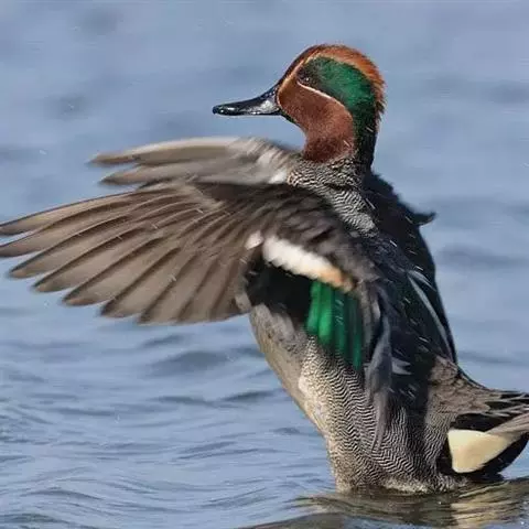 绿翅鸭是小型鸭类,体长37厘米,体重约0.5千克。嘴脚均为黑色。雄鸟头至颈部深栗色,…