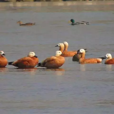 豆雁,雁形目鸭科。成鸟头、颈、背灰褐色,带淡黄色羽缘;尾上覆羽白色,尾羽黑褐色带白端,…