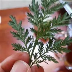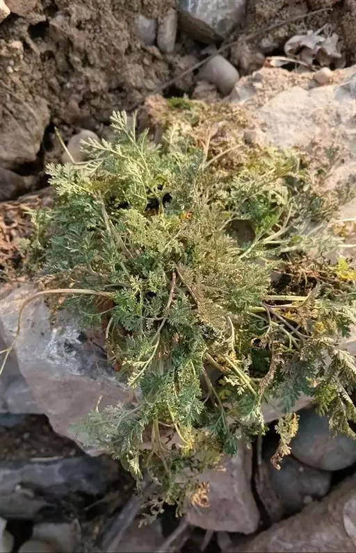 性状鉴别:茎圆柱形,上部多分枝,长30-80cm,直径0.2-0.6cm,表面黄绿色或棕黄色,具纵棱线;质略硬,易折断,断面中部有髓。叶互生,暗绿色或棕绿色,卷缩,碎,完整者展平后为三回羽状深裂,裂片及小裂片矩圆形或长椭圆形,两面被短毛。气香特异,味微苦。以色绿、叶多、香气浓者为佳。