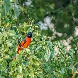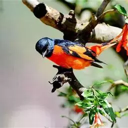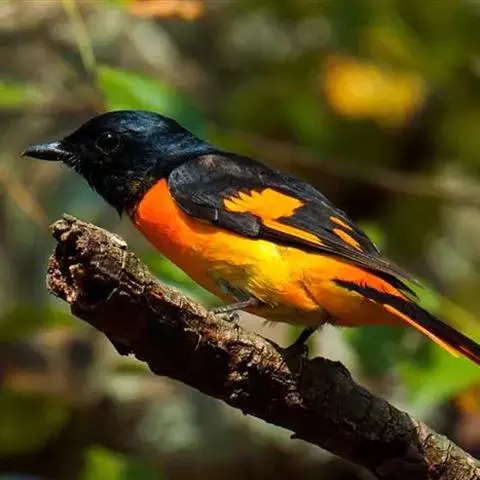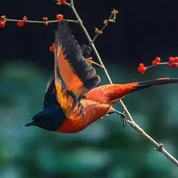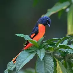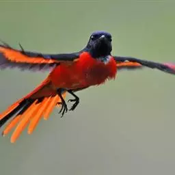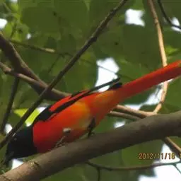 长尾山椒鸟 山椒鸟头顶至上背亮黑色,腰、尾上覆羽和下体猩红色,中央尾羽黑色,外侧尾羽具显著的红色。翅羽黑色,但有宽阔的红色翼斑,内侧数枚飞羽先端有椭圆形红斑,翼侧形成一例红点,非常美丽。嘴黑色,眼睛赤黑眶绿色,足黑色。雌乌的颜色却是黄色,而不是红色。