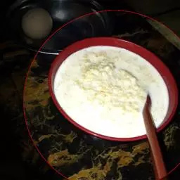 把奶皮下面的牛奶倒出,留少许牛奶在碗内。