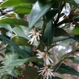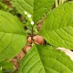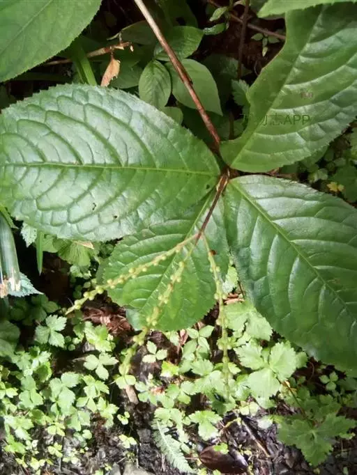 叶对生,通常4片生于茎上部,纸质,宽椭圆形、卵状椭圆形或倒卵形,长9-18厘米,宽5-9厘米,顶端渐尖,基部楔形至宽楔形,边缘具锯齿,齿端有一腺体,背面中脉、侧脉有鳞屑状毛;叶脉6-8对;叶柄长0.5-1.2厘米;鳞状叶卵状三角形,膜质。托叶小,钻形。穗状花序顶生,通常两歧或总状分枝,连总花梗长10-16厘米,总花梗长5-8厘米;苞片通常宽卵状三角形或近半圆形;花白色;雄蕊3枚,基部几分离,仅内侧稍相连,中央药隔长3毫米,有1个2室的花药,两侧药隔稍短,各有1个1室的花药,药室在药隔的基部;子房卵形,无花柱,柱头近头状。核果球形,长约3毫米,具短柄。花期4-6月,果期7-8月 。