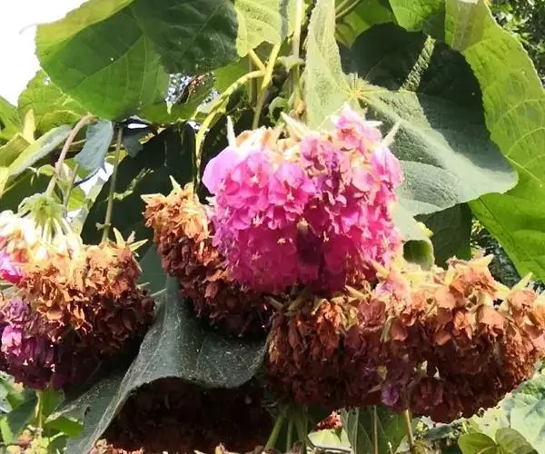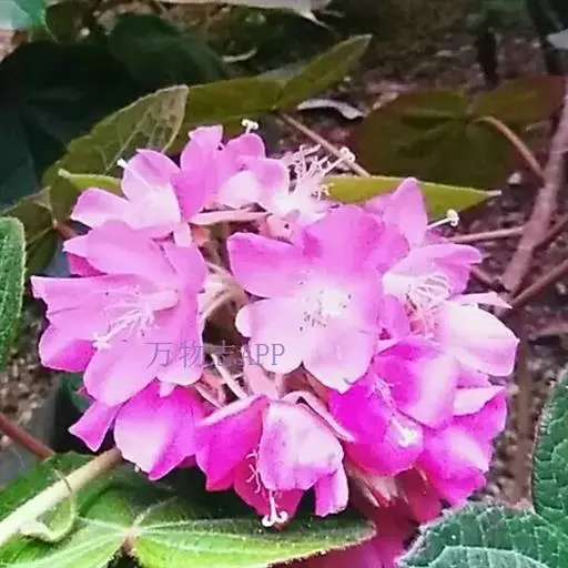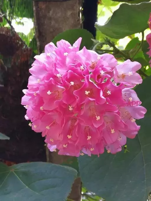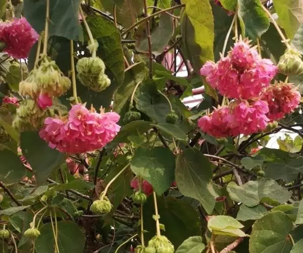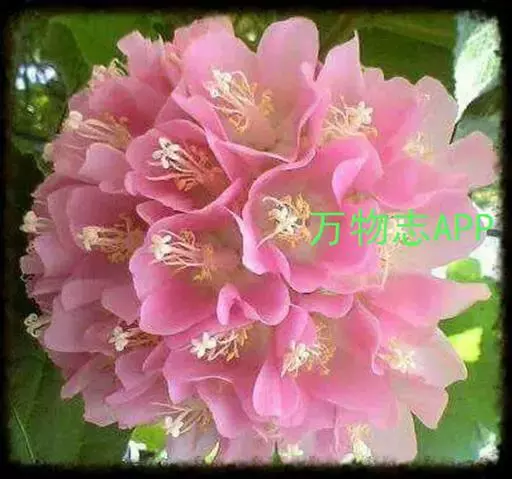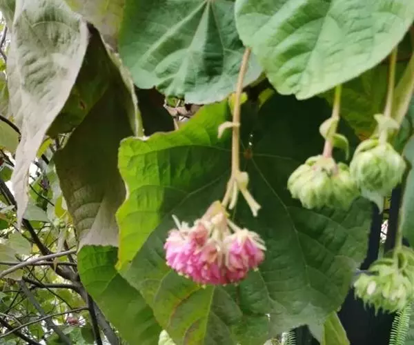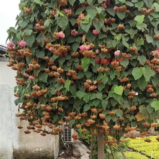 花从叶腋间伸出,悬吊著一个花苞。花为伞形花序,因此开花时会长出花轴,花轴下辐射出具等长小花梗的小花。一个花球可包含二十多朵粉红色的小花,每朵小花有瓣5块,约2.54厘米大,有一白色星顶状雄蕊及多枝雌蕊围绕。全开时聚生且悬吊而下,冬季开花,花期为由12月至翌年3月。