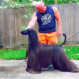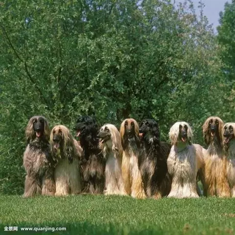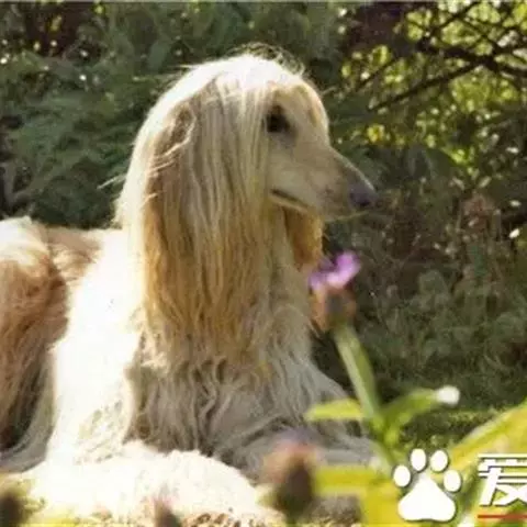 阿富汗猎犬全身披丝绢状的长毛,毛色鲜艳,呈多种颜色,背中线附近毛短,…