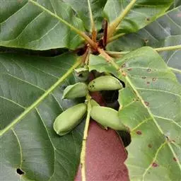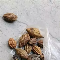 果卵形,短尖,长2.7-4厘米,径1.2-2.3厘米,无毛,具明显的锐棱角5条,成熟时外果皮脆薄,呈青黑色或栗色;种子1颗,白色,长2.5厘米,径约1厘米,圆柱状纺锤形。花期初夏,果期秋末。