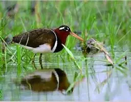 凤头麦鸡:中型涉禽,体长29-34厘米。头顶具细长而稍向前弯的黑色冠羽,像突出于头顶的角,甚为醒目。…