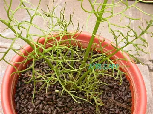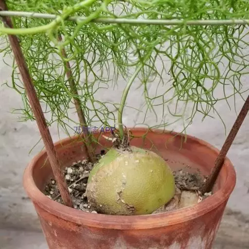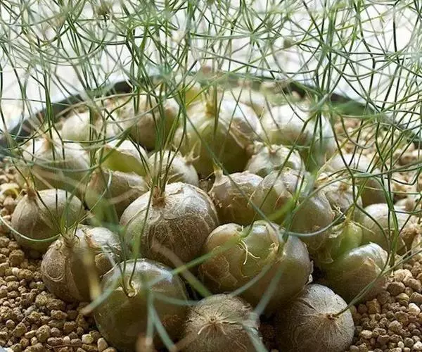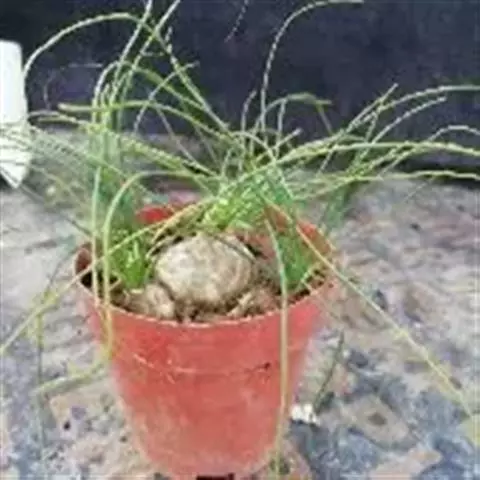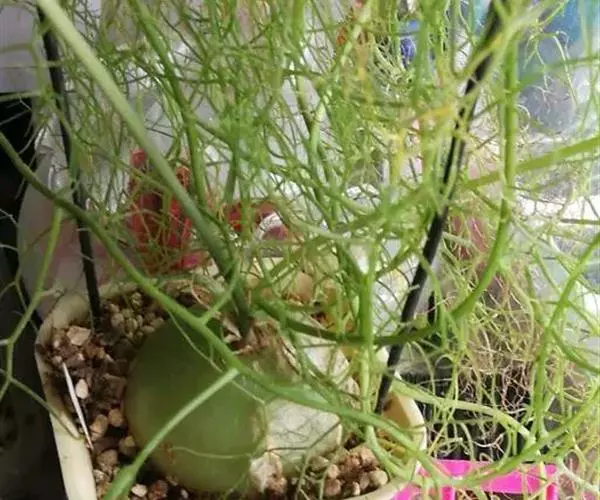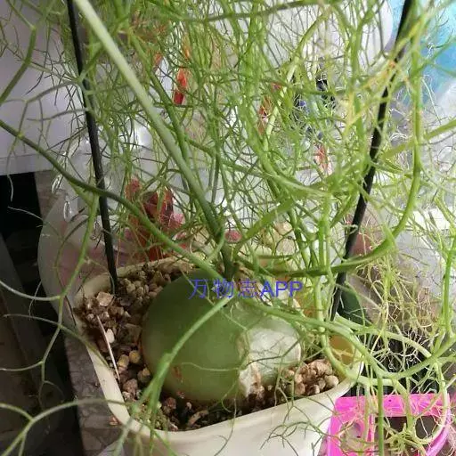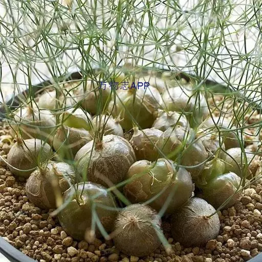 多年生草本多浆植物。植株具大型肉质球茎,洋葱状,凹陷球状,直径20-30厘米,表皮淡绿色,有光泽。根,肉质,白色,直径5毫米。春季由球茎顶部长出一对细长的对生叶,然后再簇生出绿色枝条,长2.5 -6(-10)米,缠绕攀援,枝条上有细小的绿色线形鳞片状叶,但早脱落,很小,线状披针形,具管状,寿命短,很快被真鳞片的开花茎所取代迅速。随着它的成熟,形成密集的花边分支并呈现出完整的外观。分支钻成7厘米长,直径2-7厘米。当秋天到来时,增长就会死去,进入休眠期。片狭披针形,长3-5毫米,具短刺。