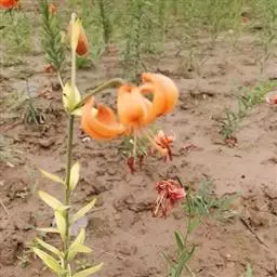 川百合:鳞茎为扁球形,白色。茎干绿色,上半部有小突起及稀疏的绵毛。叶片散生,为线状披针形, 边缘反…