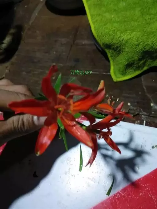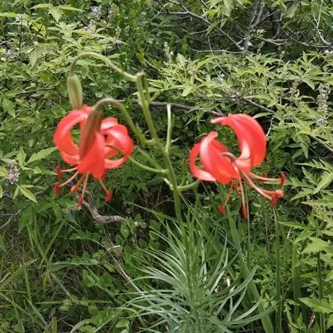 花1-5朵排成近伞形或总状花序;花梗长1.2-4.5厘米;花直立,星状开展,深红色,无斑点,有光泽;花被片矩圆状披针形,长2.2-4厘米,宽4-7毫米,蜜腺两边具乳头状突起;雄蕊向中心靠拢;花丝长1.8-2厘米,无毛,花药长矩圆形,长约7毫米;子房圆柱形,长1-1.2厘米,宽2.5-3毫米;花柱稍短于子房,柱头稍膨大。