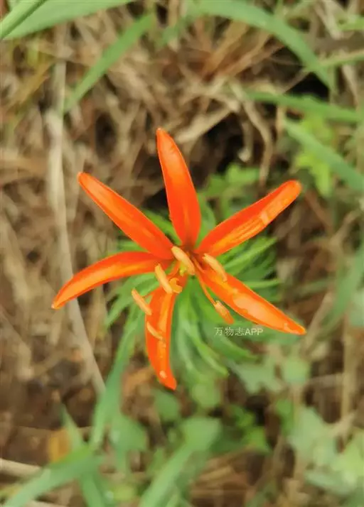 渥丹(学名:Lilium concolor Salisb.):鳞茎卵球形,高2-3.5厘米,直径2-3.5厘米;鳞片卵形或卵状披针形,白色,鳞茎上方茎上有根。茎高30-50厘米,少数近基部带紫色,有小乳头状突起。叶散生,条形,脉3-7条,两面无毛。花1-5朵排成近伞形或总状花序;花直立,星状开展,深红色,无斑点,有光泽;花被片矩圆状披针形,蜜腺两边具乳头状突起。蒴果矩圆形。花期6-7月,果期8-9月。