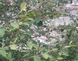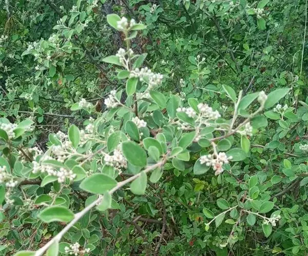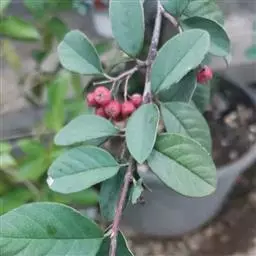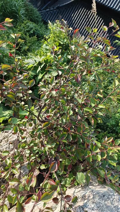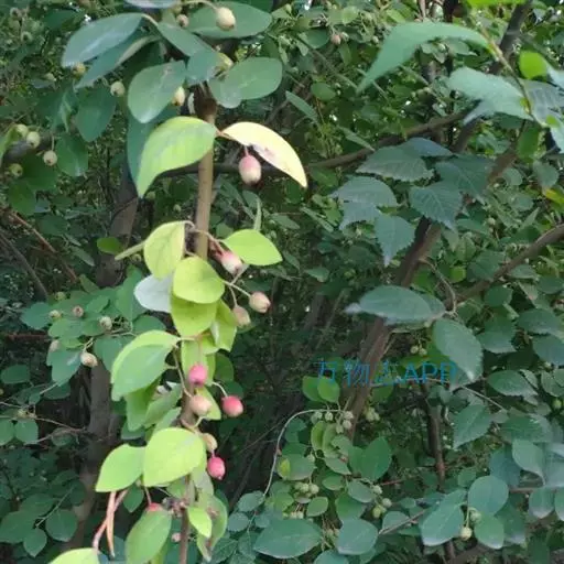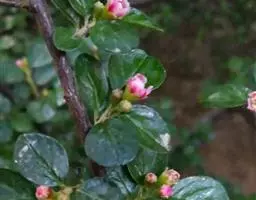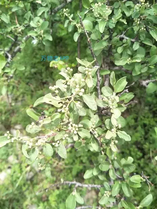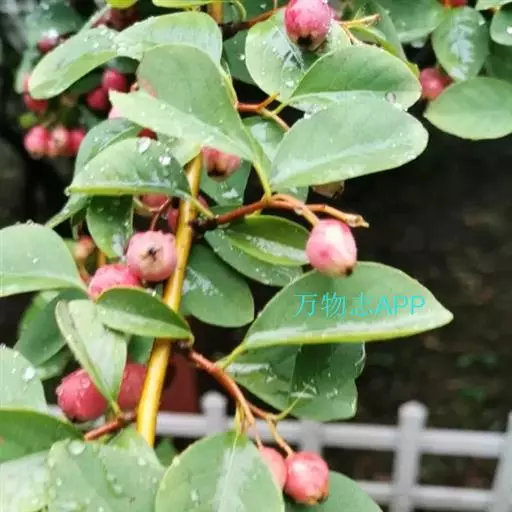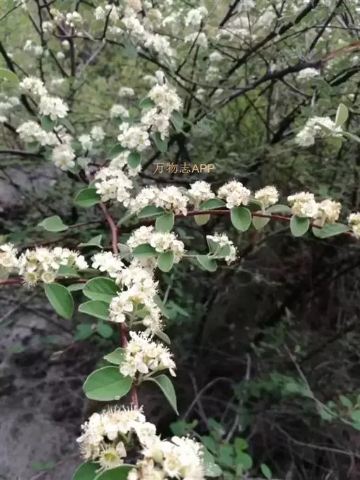 水栒子 落叶灌木,高达4米;枝条细瘦,常呈弓形弯曲,小枝圆柱形,红褐色或棕褐色,无毛,幼时带紫色,具短界毛,不久脱落。叶片卵形或宽卵形,长2-4厘米,宽1.5-3厘米,先端急尖或圆钝,基部宽楔形或圆形,上面无毛,下面幼时稍有绒毛,后渐脱落;叶柄长3-8毫米,幼时有柔毛,以后脱落;托叶线形,疏生柔毛,脱落。