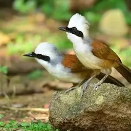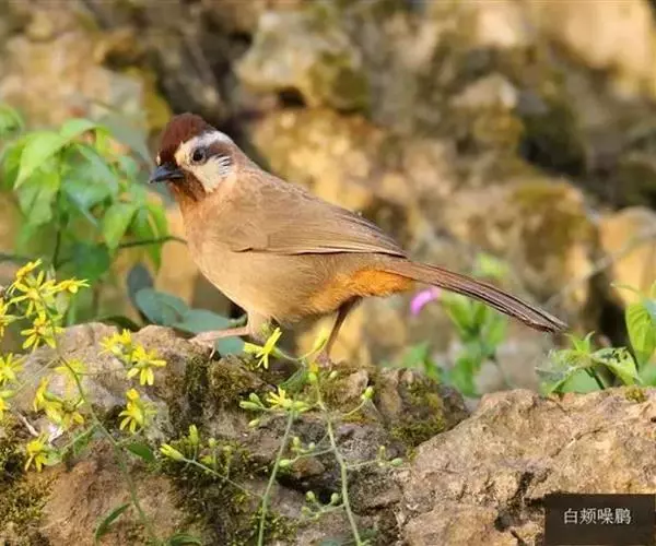 白颊噪鹛(学名:Pterorhinus sannio):中型鸟类,体长21-25厘米。雌雄羽色相似。前额至枕深栗褐色,眉纹白色或棕白色、细长,往后延伸至颈侧。背、肩、腰和尾上覆羽等其余上体包括两翅表面棕褐或橄榄褐色,尾栗褐或红褐色,飞羽暗褐色,外翈羽缘沾棕。颊、喉和上胸淡栗褐色或棕褐色,下胸和腹多呈淡棕黄色或淡棕色,两胁暗棕色。特征明显,野外容易识别。 相似种画眉眼周白色,颊不为白色,明显可与之区别。