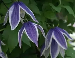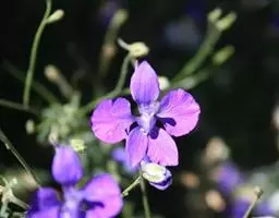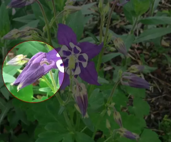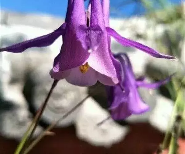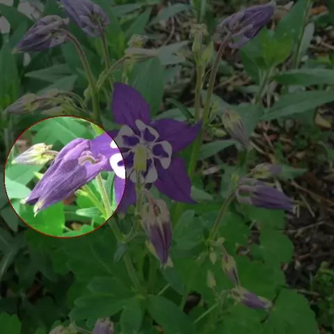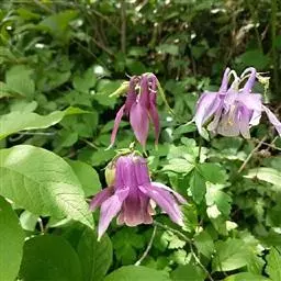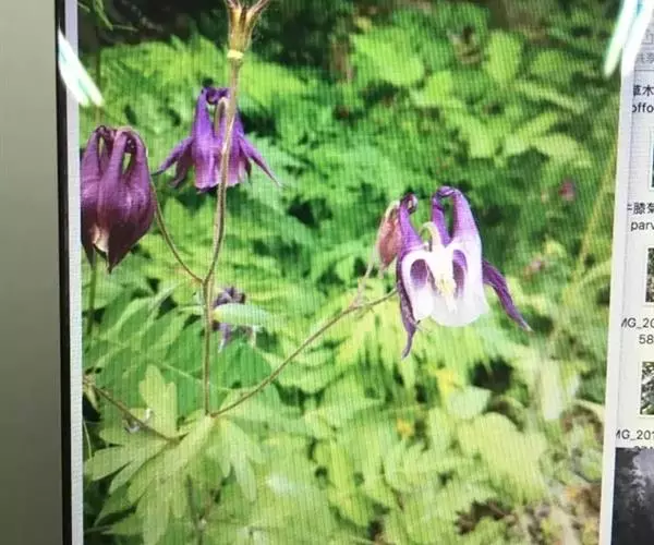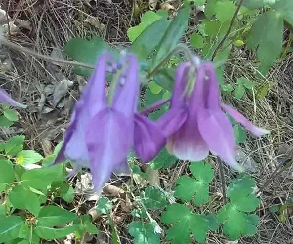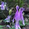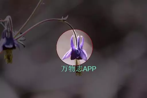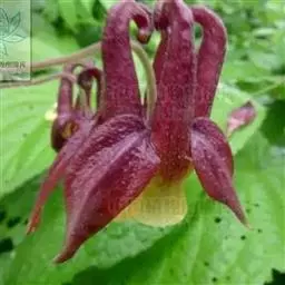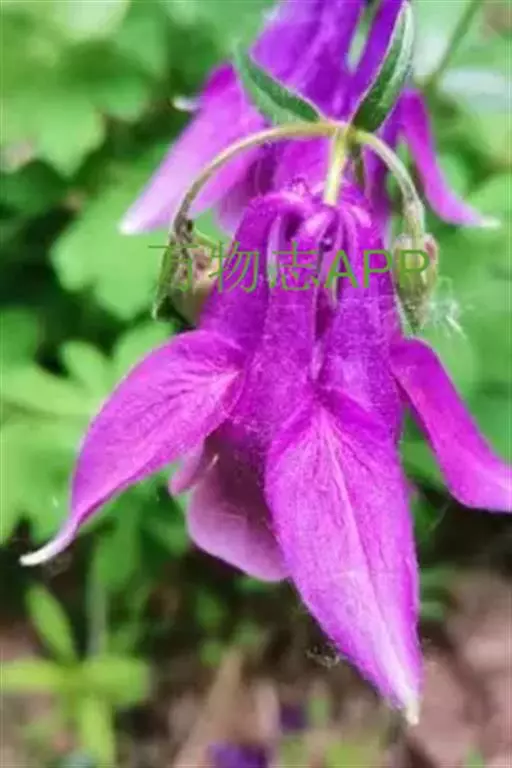 华北耧斗菜 多年生草本,高达60厘米,根粗壮,暗褐色,茎直立,圆柱形,具肋棱,上部被柔毛和腺毛。 基生叶有长柄,为一或二回三出复叶;小叶菱状倒卵形或宽菱形,先端三裂,叶面上无毛,下面被短柔毛;茎生叶与基生叶相似,较小,花数朵,下垂,构成聚伞形花序;花梗长,密被短腺毛;萼片5,紫色,卵状披针形;花瓣与萼片同色,顶端圆截形,有距,向内弯曲;雄蕊多数,心皮5,子房密被短腺毛。蓇葖果,种子小,黑色,有光泽 种皮上具点状皱纹,花期6-7月,果期7-9月。
