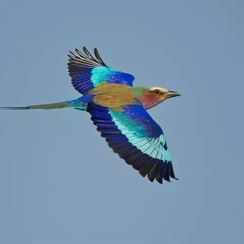 蓝胸佛法僧(学名:Coracias garrulus)中型鸟类,体长31~33厘米,通体淡蓝绿色。翅膀长而宽,除栗色背羽外大部分为蓝色。额、眼先、耳羽淡褐色;头顶、颊、腰淡蓝绿色。背、肩、最内侧数枚飞羽沙棕色。翼覆羽绿蓝色,小,中覆羽端部沾沙棕色,其余飞羽黑褐色。尾上覆羽、尾羽褐色。覆羽沾满绿蓝色。颏近白色,喉以下淡绿蓝色,喉至胸沾淡黄褐色。翅膀前缘鲜中蓝色,翅尖黑色。翅和尾上有一淡蓝色斑。