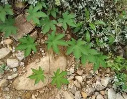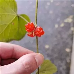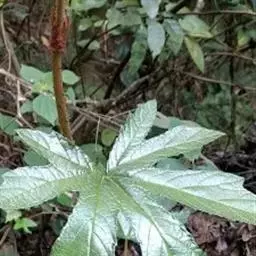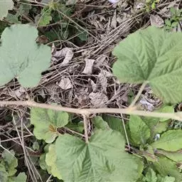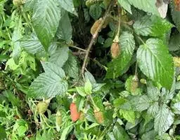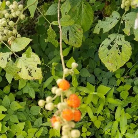 木莓 木莓一般高2-3m。幼枝绿色,有白粉,有少数倒刺。单叶互生;叶柄长3-4.5厘米;托叶线状披针形;叶片近圆形,直径5-9厘米,呈掌状深裂。