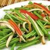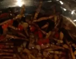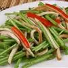 2、炒锅加油烧热,下红椒丝和香干翻炒,加入少许盐、蒜粉、生抽调味,如果太干可加入少许水;