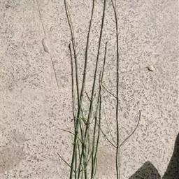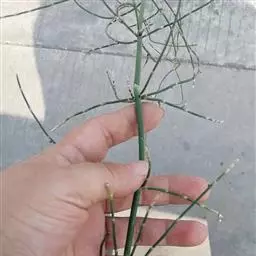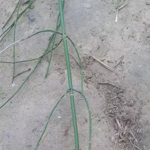 全草长约30厘米,多干缩,或枝节脱落,茎略扁圆形或圆形,浅绿色, 有细纵沟,节间长,每节有退化的鳞片叶,鞘状,先端齿裂,硬膜质。小枝轮生,鞘部渐细,基部有时带有部分的根,呈黑褐色。气微,味稍苦涩。
