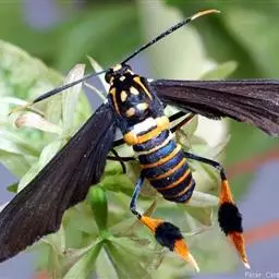 前翅窄长,灰褐色,翅脉、中室内及脉间条纹黑褐色。后翅黑色,中室端部及中室外方有7个白斑,翅缘有白色和红色的缘斑。尾突端部圆锤形,柄细。