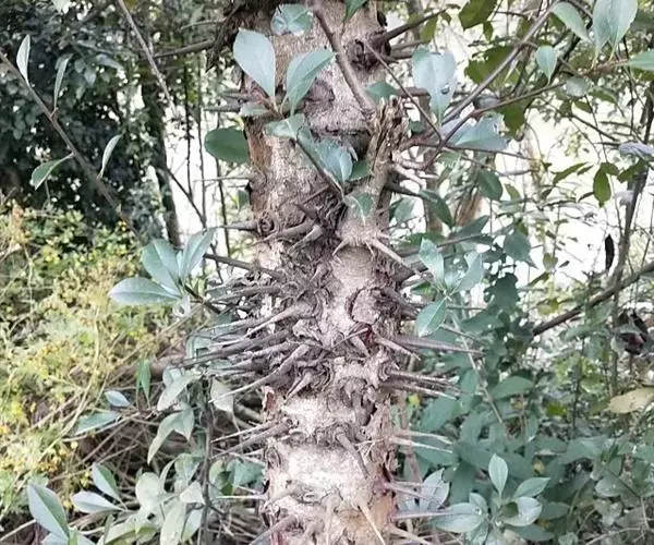 乔木;幼枝褐色,无毛。叶片革质,卵形、倒卵形或长圆形,长4.5-9厘米,宽1.5-4厘米,先端尾尖,基部楔形,边缘有刺状齿,两面皆无毛,或脉上微有柔毛以后脱落,侧脉约10对;叶柄长1-1.5厘米,无毛,上面有纵沟。复伞房花序顶生,直径约5厘米,总花梗和花梗有柔毛;花直径约1厘米;萼筒杯状,有柔毛;萼片三角形,长1毫米,先端急尖或钝,外面有柔毛;花瓣白色,近圆形,直径约4毫米,先端微缺,无毛;雄蕊20,较花瓣稍短;花柱2-3,合生。花期5月。