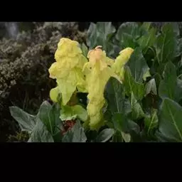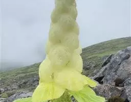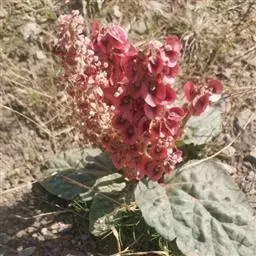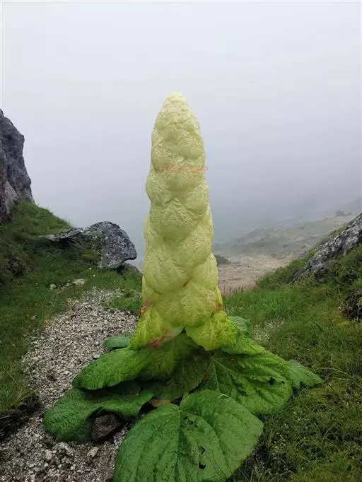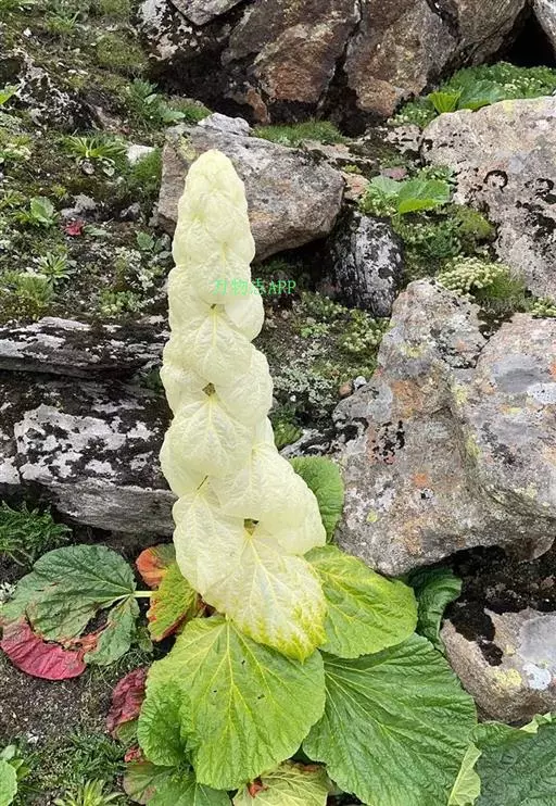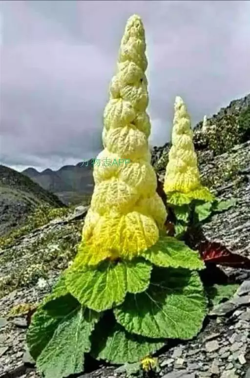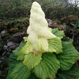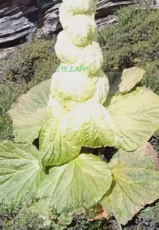 塔黄(学名:Rheum nobile Hook. f. et Thoms.):多年生草本,高1-2米。茎直立,粗壮,不分枝,具多数基生叶及大型苞片。基生叶卵圆形或近圆形,先端圆钝,基部浅心形,革质,上面无毛,下面具小突起;叶柄粗壮,长8-15厘米;托叶鞘膜质,红褐色;苞片卵圆形或圆形,膜质,淡黄色,具网状脉,反折,遮盖花序,花时脱落。花序圆锥状,分枝密集,无毛;花两性,花被片6,成2轮,宿存,椭圆形,淡绿色,花丝细长,外露;花梗中下部具关节;雄蕊9;花盘不发达,子房卵形,具3棱,花柱3,较短,柱头膨大成头状。瘦果连翅成宽卵形。