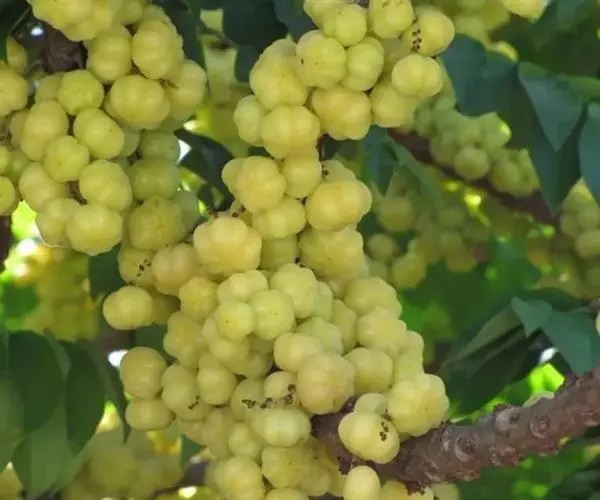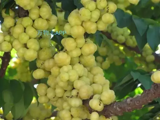 西印度醋栗是大戟科叶下珠属常绿灌木或小乔木,树高2-5米,夏至秋季开花,花后座果率较高,成熟果实扁球形,具凸稜,淡黄绿色,可食用,生食口感爽脆, 水分多,但味酸,主要用于制造果酱、果汁、或是腌渍后食用。西印度醋栗植株优美,花小,粉红色,开在老枝干上,花后结许多青色的小果,娇小可爱。因为怕冻,植株种植在温室内,果实每年六月初成熟,色泽圆嫩,玉质透明,有纵棱,细看像微型的水晶小南瓜,又象是一群微笑的玉娃。