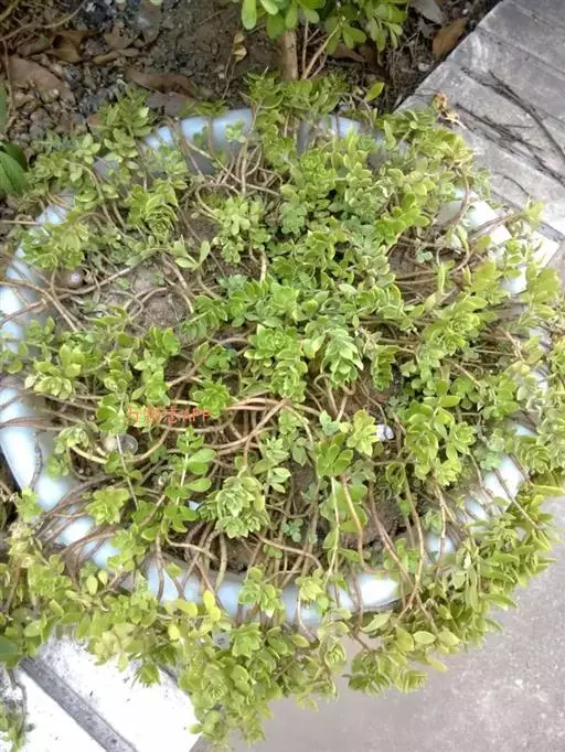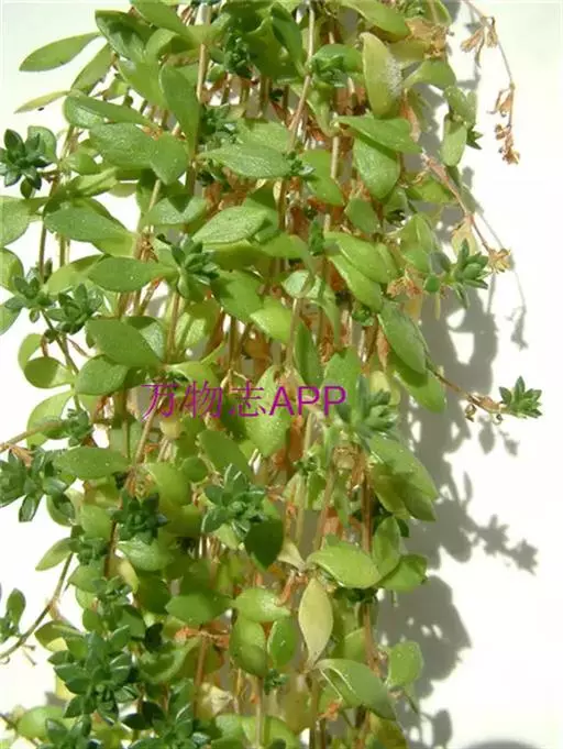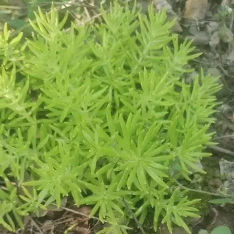 垂盆草,多年生肉质草本。其茎纤细,长可达500px以上,部分节上可见纤细的不定根。3叶轮生,叶片倒披针形至矩圆形,绿色,肉质,长1.5~70px,宽0.3~17.5px,先端近急尖,基部急狭,有距。气微,味微苦。喜阴湿环境,较耐寒。常生于海拔1600m以下的向阳山坡、石隙、沟边及路旁湿润处。