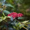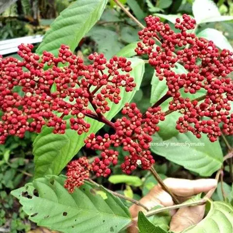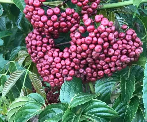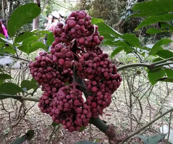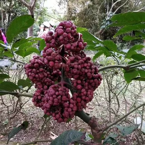大型伞房状复二歧聚伞花序,直径达50厘米;花梗极短或几无梗,微被乳突状毛;花蕾高约3毫米;萼杯形,萼片三角形,顶端急尖,外面无毛,花瓣5,花瓣裂片椭圆形,长约5毫米;雄蕊5,花丝长1.2-1.6毫米,花药黄色;子房卵圆形,柱头不明显扩大。果实暗红色,扁球形,直径约8厘米。