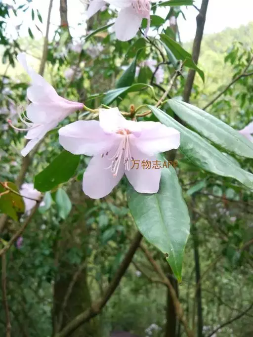 鹿角杜鹃(学名:Rhododendron latoucheae Franch.):常绿灌木或小乔木,高可达5米;小枝开展,灰色或淡白色,无毛。叶集生,近于轮生,革质,卵状椭圆形或长圆状披针形,上面深绿色,具光泽,下面淡灰白色,叶柄无毛。花芽长圆状锥形,单生枝顶叶腋,花梗无毛;花萼不明显;花冠白色或带粉红色,裂片开展,长圆形,花丝扁平,子房圆柱状,褐色,蒴果圆柱形,花柱宿存。3-4月开花,稀5-6月,7-10月结果。