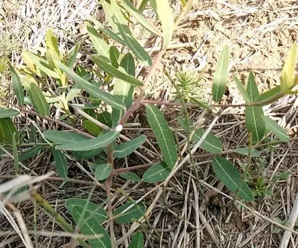 叶片近革质,稍厚,长圆形,长4-8厘米,宽5-15毫米,顶端短凸尖,基部稍狭,两叶基相连成短鞘状,微抱茎,脉3-5条,中脉明显,上部叶较狭,近线形。